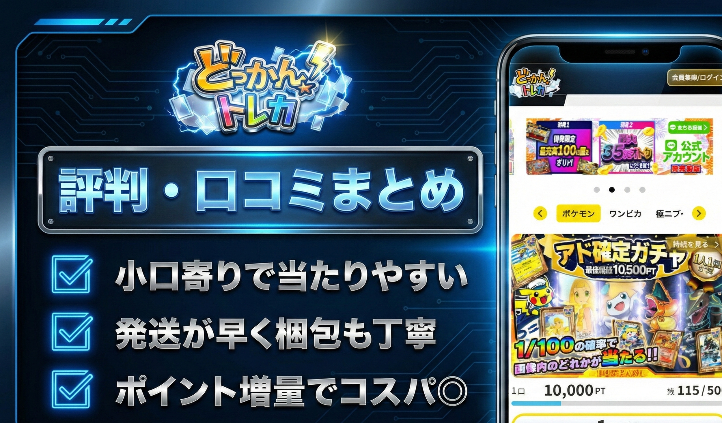 どっかん!トレカは、株式会社どっかんが運営するオンラインオリパサービスです。主にポケモンカードやワンピースカードなどの人気トレーディングカードゲームのオリパを取り扱っており、独自の演出やキャンペーンでユーザーを楽しませています。